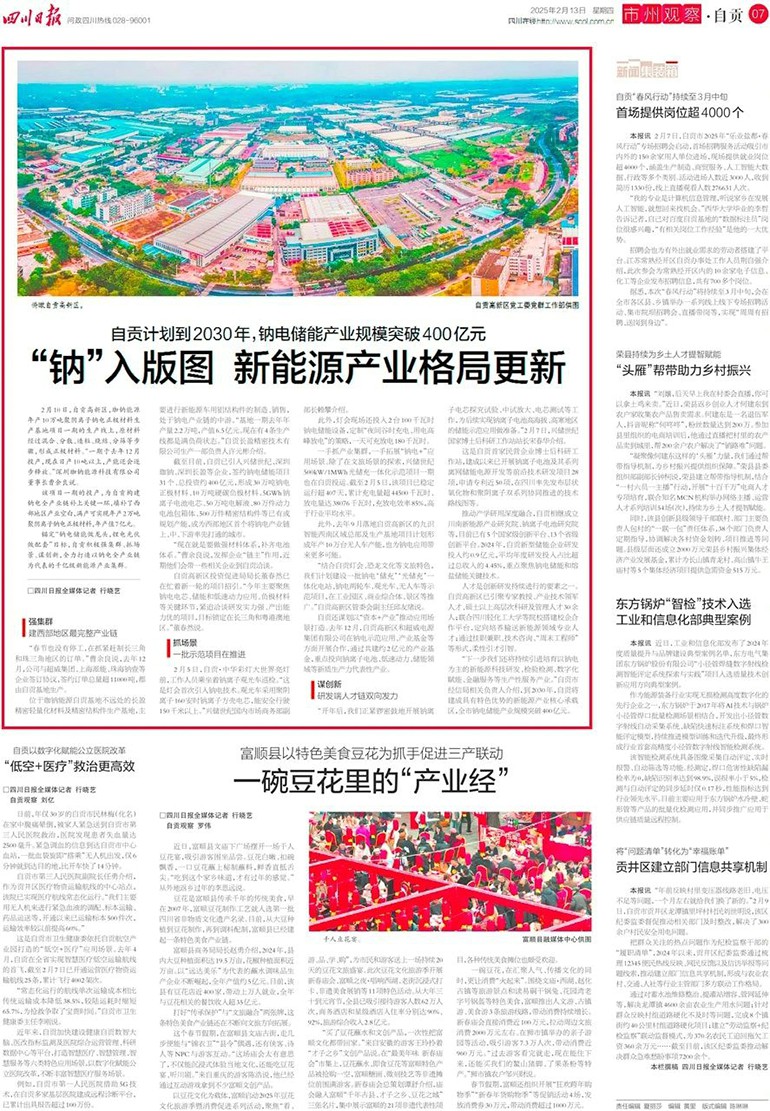 “开年后,我们正紧锣密鼓地开展钠离子电芯探究试验、中试放大、电芯测试等工作,为后续实现钠离子电池高海拔、高寒地区的储能示范应用做准备。”2月7日,兴储世纪国家博士后科研工作站站长宋春华介绍。这是自贡首家民营企业博士后科研工作站,建成以来已开展钠离子电池及其系列离网储能电源开发等前沿技术研发项目28项,申请专利近50项,在四川率先发布层状氧化物和聚阴离子双系列协同推进的技术路线图等。推动产学研用深度融合,自贡相继成立川南新能源产业研究院、钠离子电池研究院等,目前已有5个国家级创新平台、13个省级创新平台。2024年,自贡新型储能企业研发投入约0.9亿元,平均年度研发投入占比超过总收入的4.45%,重点聚焦钠电储能和熔盐储能关键技术。人才是创新研发持续进行的要素之一。自贡高新区已引聚专家教授、产业技术领军人才、硕士以上高层次科研及管理人才30余人;联合四川轻化工大学等院校搭建校企合作平台,定向培养输送新能源领域专业人才;通过挂职兼职、技术咨询、“周末工程师”等形式,柔性引才引智。“下一步我们还将持续引进培育以钠电为主的新能源科技研发、检验检测、数字化赋能、金融服务等生产性服务产业。”自贡市经信局相关负责人介绍,到2030年,自贡将建成具有特色优势的新能源产业核心承载区,全市钠电储能产业规模突破400亿元。