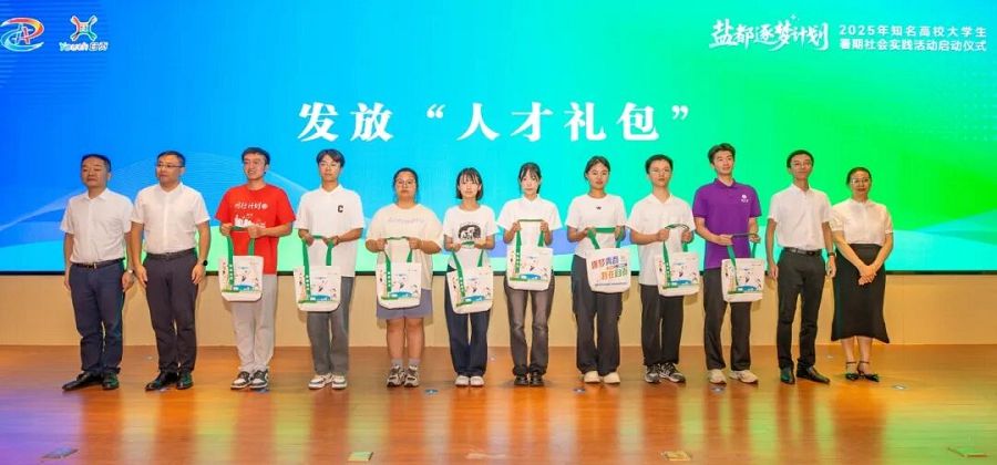 启动仪式上,《SALT 自贡》城市宣传片展现了自贡的盐韵风华与发展活力。市委组织部副部长、市委人才办主任吴华动作人才发展环境推介,详细介绍了自贡的历史底蕴、发展优势及人才支持政策。西南石油大学团委向团市委授予“大学生社会实践基地”牌匾,标志着校地合作再添新平台。随后,清华大学、同济大学、重庆大学3名学生代表发言,表达对实践探索、服务地方的期待。与会领导为学生代表发放包含人才政策、文旅手册、文创产品、消费券等在内的“人才礼包”,共同启动实践活动。