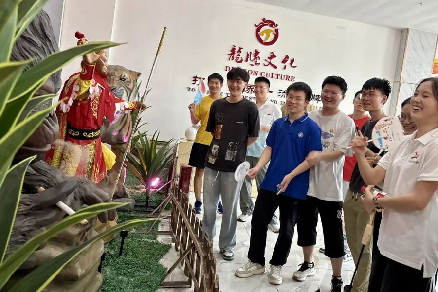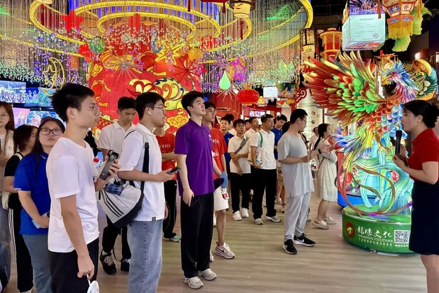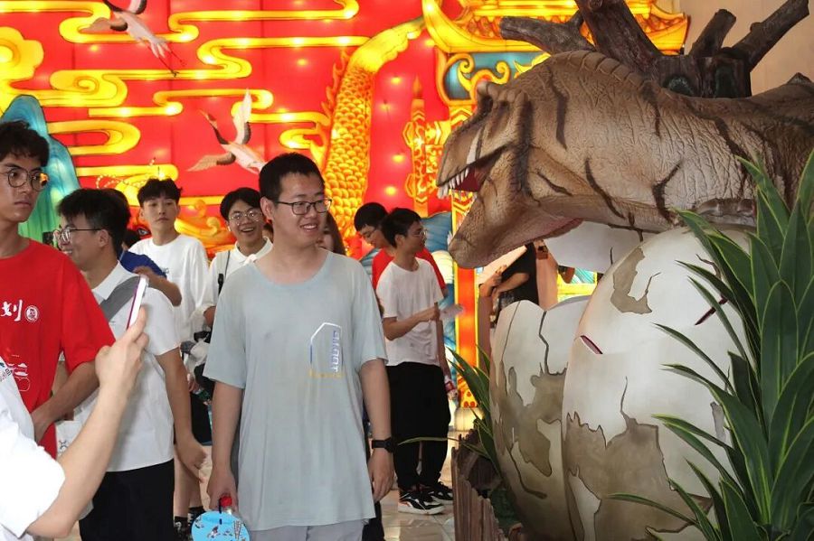 走进自贡市龙腾文化艺术有限公司,同学们仿佛踏入了一个充满奇思妙想的世界。一件件精美的彩灯和一只只栩栩如生的仿真恐龙让人眼前一亮,大家纷纷拿起手机拍照打卡,记录下这难忘的瞬间。大家兴致勃勃地与仿真恐龙互动,沉浸于自贡独特的彩灯与恐龙文化产业之中,感受着传统文化与现代创意的完美融合。