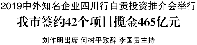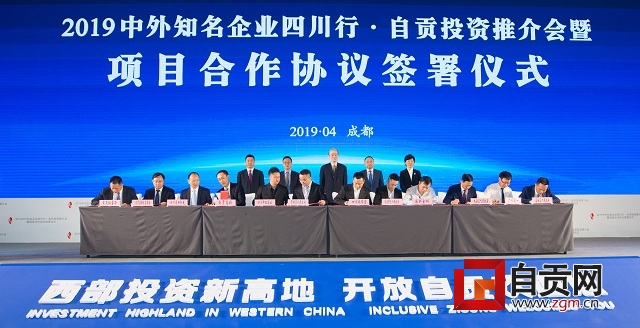 4月17日,2019中外知名企业四川行活动在蓉启幕。作为该活动的重要组成部分,自贡投资推介会暨项目合作协议签署仪式于当天下午在成都举行,向国内外企业家朋友推介西部投资新高地自贡的发展新机遇。活动期间,我市共签约42个项目,涵盖电子信息、航空与燃机、医疗健康、文化旅游、食品加工等产业,总投资额465.1亿元。省人大常委会副主任刘作明出席推介会并见证签约。市委副书记、市长何树平致辞。省经济合作局二级巡视员刘继强参加推介会。市委副书记李国贵主持。