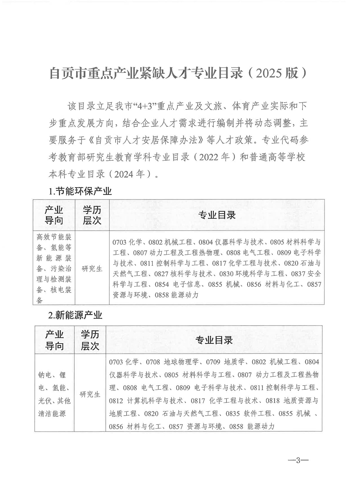 关于印发《自贡市重点产业紧缺人才专业目录 (2025版)》的通知